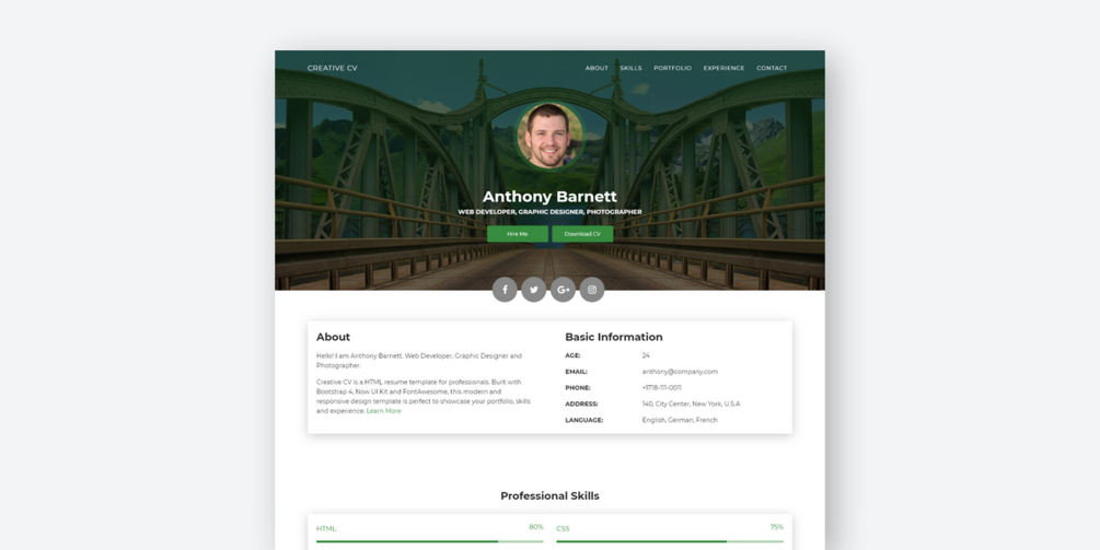 Creative CV is a HTML resume template for professionals built with Bootstrap 4, Now UI Kit and FontAwesome.
